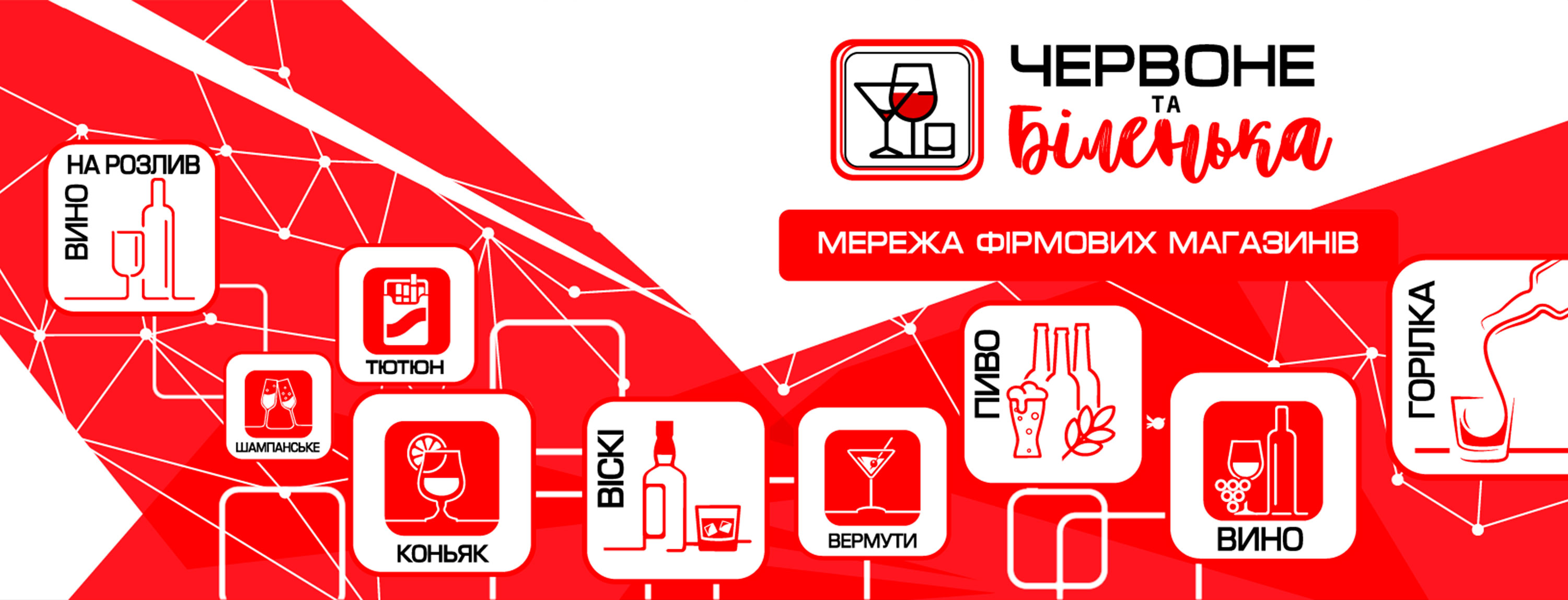 ЧЕРВОНЕ ТА БІЛЕНЬКА - МОЛОДА АМБІТНА МЕРЕЖА ФІРМОВИХ МАГАЗИНІВ АЛКОГОЛЬНИХ НАПОЇВ до ваших послуг.